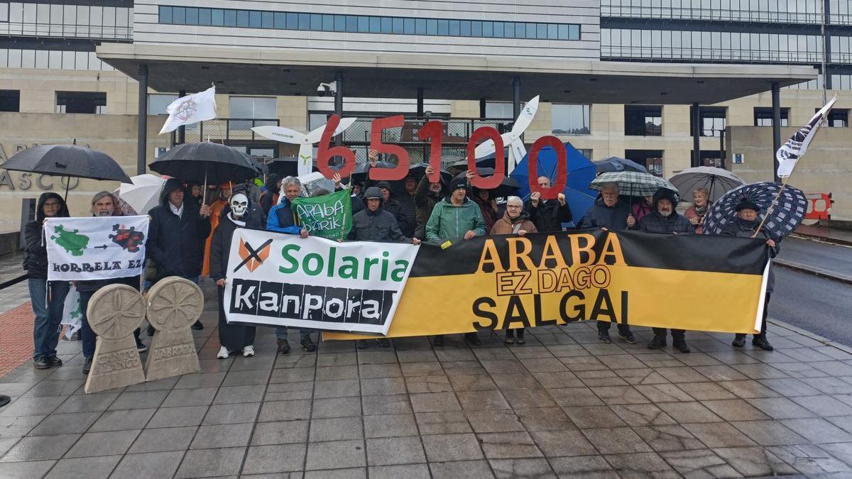 Durante la concentración que han llevado a cabo este jueves ante la sede central del Ejecutivo vasco en Vitoria-Gasteiz, los colectivos han explicado que el rechazo administrativo a estos proyectos se divide en dos ejes de actuación: la respuesta técnica inmediata a los proyectos actuales y la denuncia social de un modelo de desarrollo que se considera "especulativo".