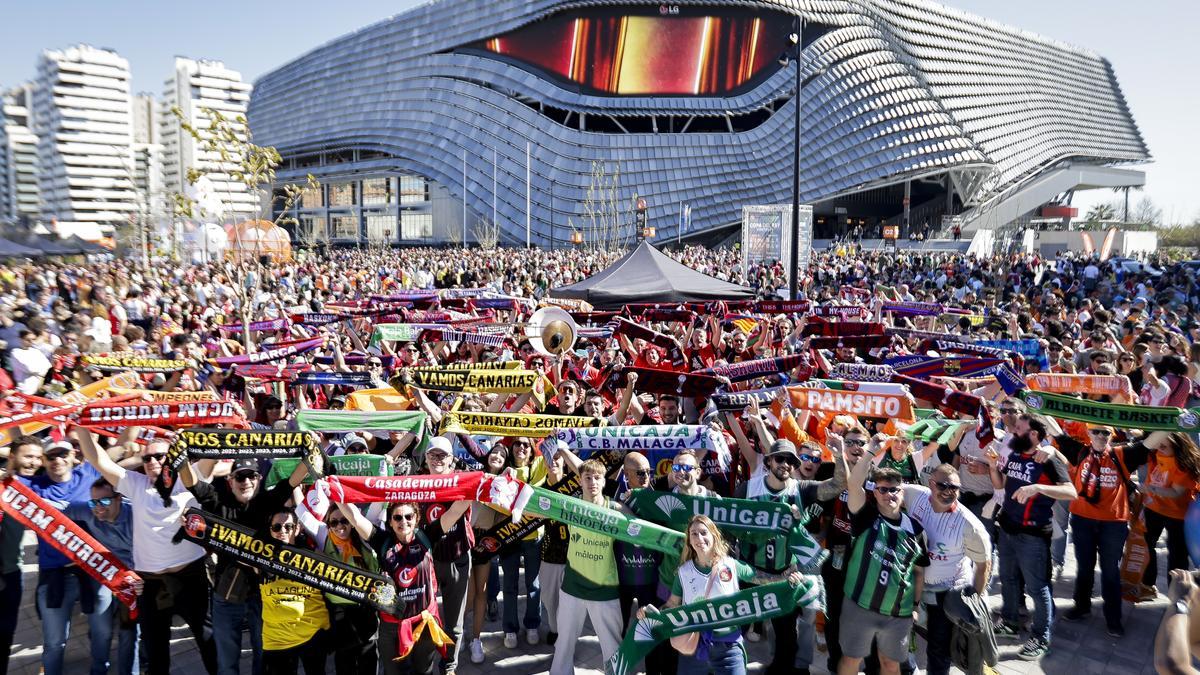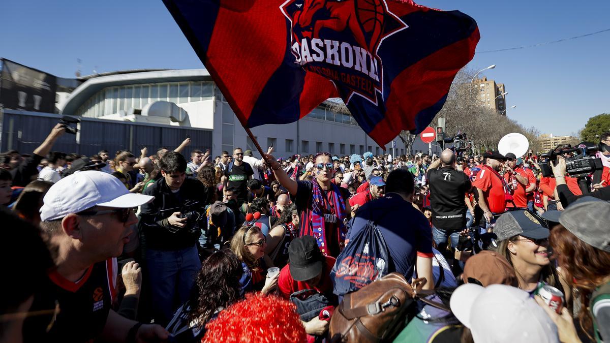 Si alguien pregunta qué es la Copa del Rey de baloncesto, las mejores imágenes para definirla son sin duda las que se generan en el encuentro de aficiones el sábado por la mañana. En el caso de la edición de Valencia de esta temporada no contó con el encanto de años anteriores en los que la kalejira atravesaba las calles emblemáticas de la ciudad anfitriona y teñía de color el centro, pero los aficionados se encargaron este sábado igualmente de convertir el paseo por los alrededores del Roig Arena en una auténtica fiesta.