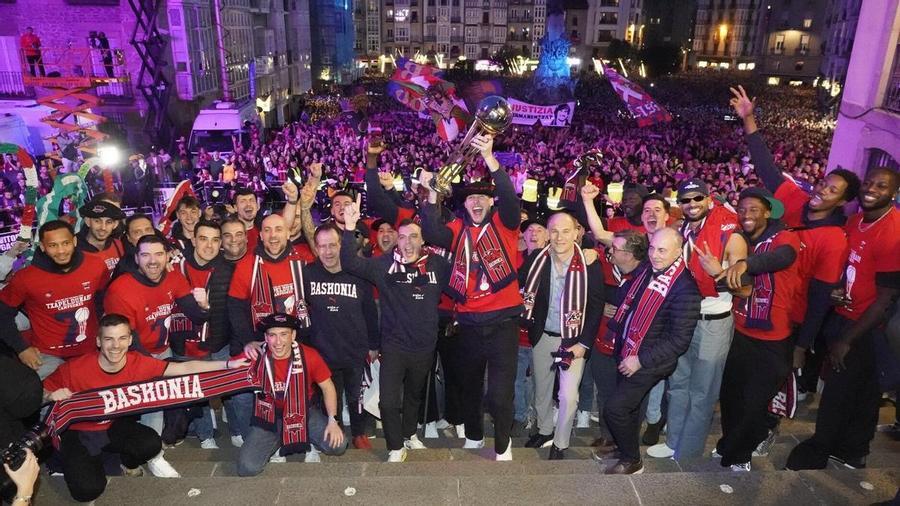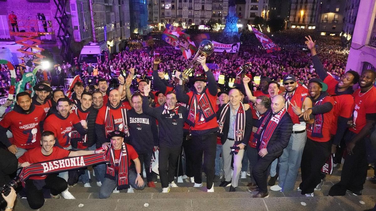 ¡Qué alegría! ¡Qué pasión! ¡Qué día inolvidable para la ciudad de Vitoria-Gasteiz y para el deporte alavés! Las dos jornadas de celebración desde que el Kosner Baskonia levantó la Copa del Rey de Valencia el pasado domingo culminaron este martes en la Plaza de la Virgen Blanca levantando de nuevo el título, pero esta vez ante toda una ciudad y los ojos de la patrona de Vitoria.