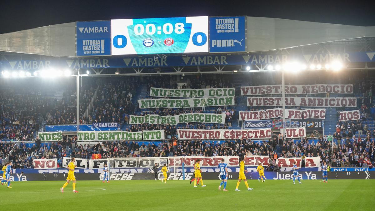 En los prolegómenos del encuentro, desde el fondo donde se ubica el principal grupo de animación albiazul se exhibieron diferentes pancartas contra la celebración de jornadas en franjas horarias que dificultan la asistencia de las aficiones.