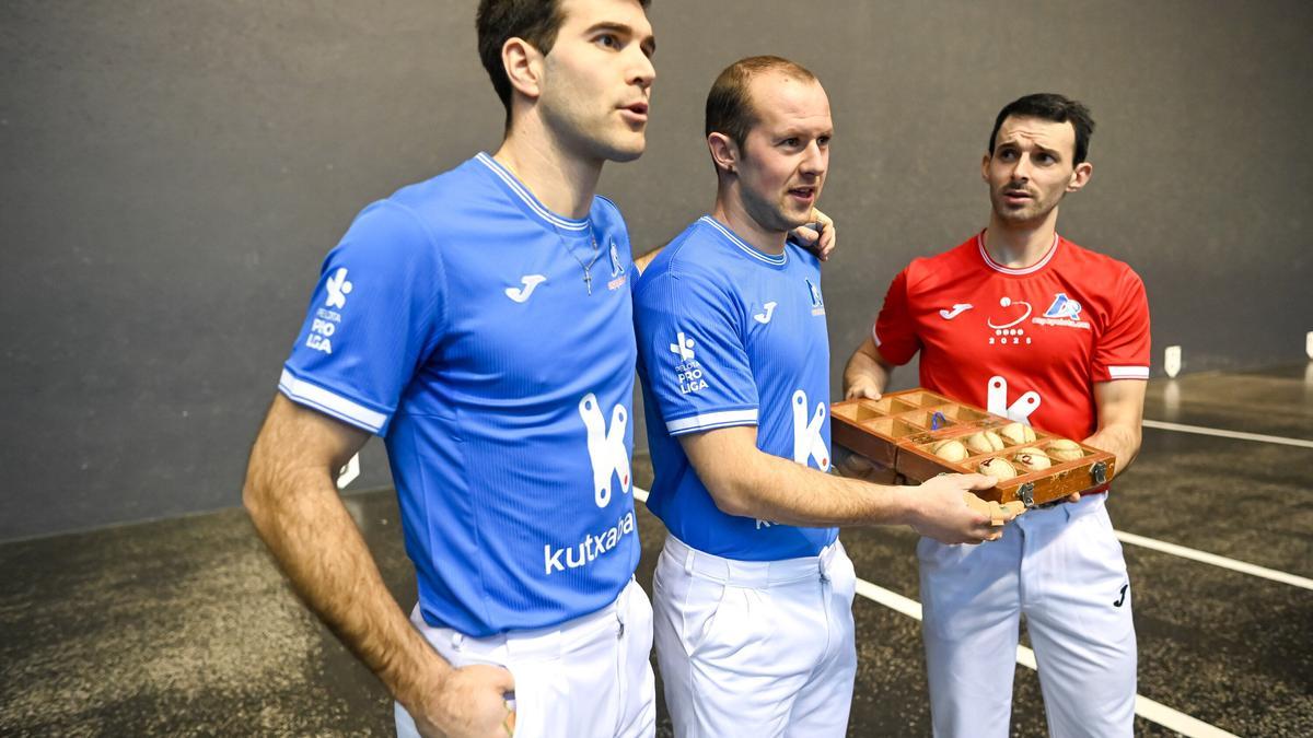 Aitor Elordi, José Javier Zabaleta y Jokin Altuna acudieron este martes al frontón Atano III de Donostia para la primera elección de material de la tanda de la liguilla de semifinales del Campeonato de Parejas. Joseba Ezkurdia no participó por un proceso febril, aunque su participación en el duelo de este sábado no corre peligro.