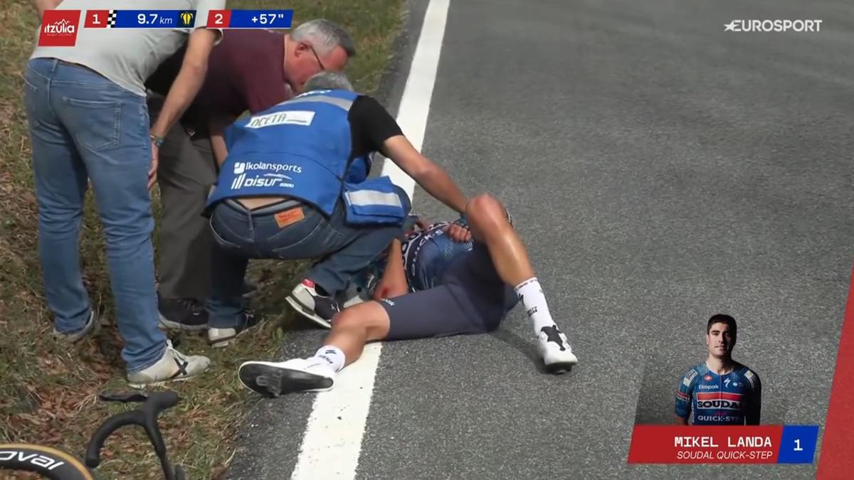 Landa se fue al suelo en el descenso de San Miguel de Aralar, a unos 9,5 km de meta, y estuvo durante algunos minutos tendido en el asfalto, acompañado de auxiliares y médicos de carrera que no se separaron de él en ningún instante.