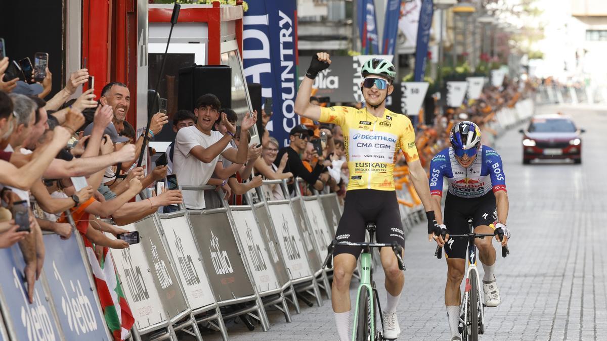 El juego por la victoria. Un kilómetro de pistards y desconfianza. Desenfundó el alemán con todo. Alcanzó la recta final con ventaja hasta que Seixas se emparejó a él, sentado, y le sobrepasó hasta eclipsar Lipowitz y agarrar la tercera victoria en la Itzulia. Napoleónico Seixas.