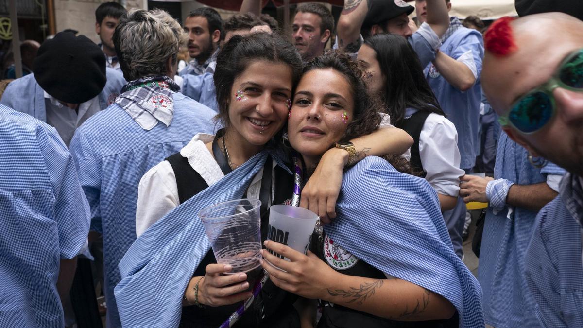 Los blusas y neskas han disfrutado de la habitual comida del 5 de agosto. Algunos, por la resaca, han podido saborearla menos, pero en todo caso, les ha servido para recargar fuerzas. Después del postre y el café se han dirigido hacia Fueros para esperar el turno de salida para iniciar el recorrido. Un recorrido, que para algunos como Martin, era la primera vez que lo hacían como miembro de una cuadrilla de blusas. Un debut complicado, ya que como reconoce el joven gasteiztarra, no ha dormido nada y “ya se empieza a notar el cansancio”. Le acompañaba su amigo Aitor, otro primerizo, que sí ha dormido algo más para poder “aguantar todo el día y la noche”.
