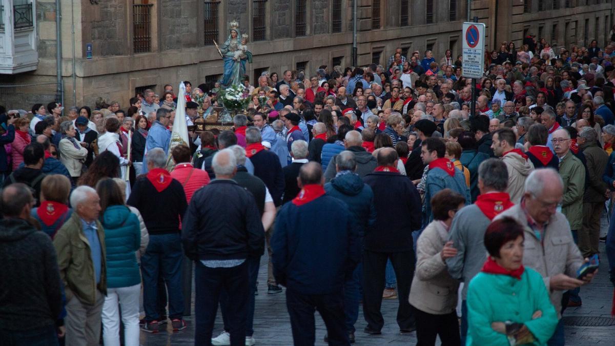 Al llegar al final de dicha calle y antes de poner rumbo hacia las cuestas de San Francisco y San Vicente, Los blusas han hecho una pausa para que los alaveses pudieran ir uniéndose poco a poco a la procesión. En ese instante las calles se encontraban casi a oscuras, y el único sonido que se podía apreciar era el de los jóvenes rezagados de la madrugada que deambulaban por la zona. Los asistentes que estuvieron presentes en el rosario a primera hora han sido en su mayoría personas mayores que han acudido tanto individualmente como en grupo, guardando silencio a la espera de que comenzara a sonar el himno de la Virgen Blanca, cuando las campanas indicaran las siete de la mañana.
