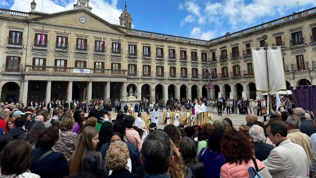 La procesión del Corpus Christi ha reunido este domingo a miles de vitorianos por el centro de la ciudad. La Catedral Nueva ha acogido previamente la solemne celebración con más de 2.000 personas desde donde ha salido la carroza de plata con la monumental custodia del siglo XVII, escoltada por medio centenar de niños y niñas de Primera Comunión.
