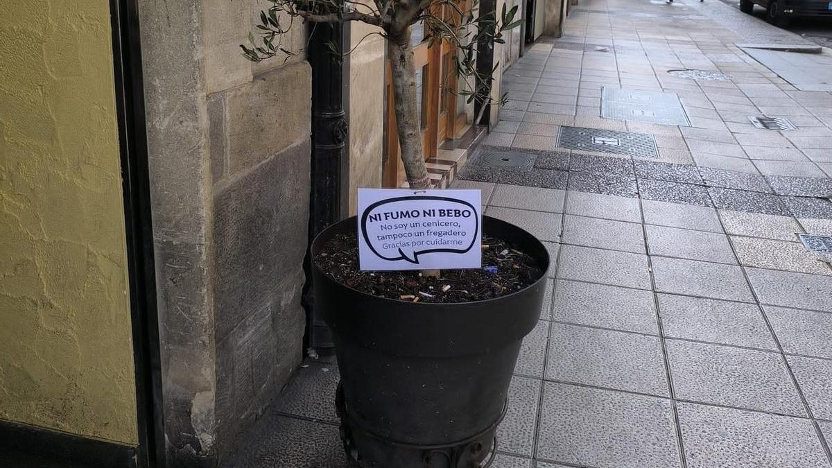 Las plantas que flanquena la entrada del popular PerretxiCo de la calle san Antonio están hartas de que quienes salen a fumar las utilicen como cenicero, como se puede ver en la fotografía de la maceta con el cartel, rodeado de colillas.