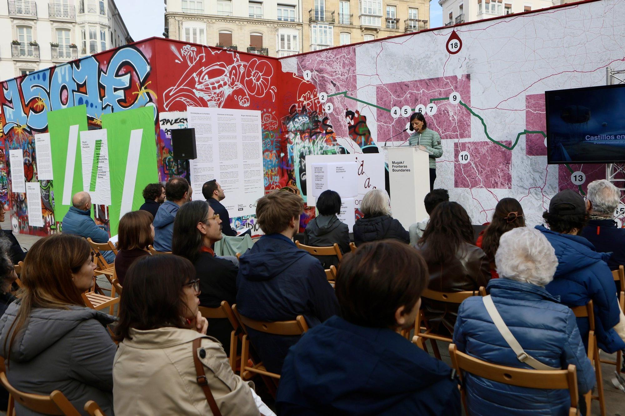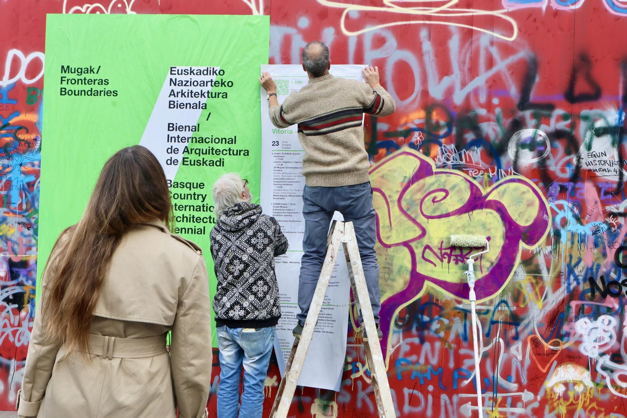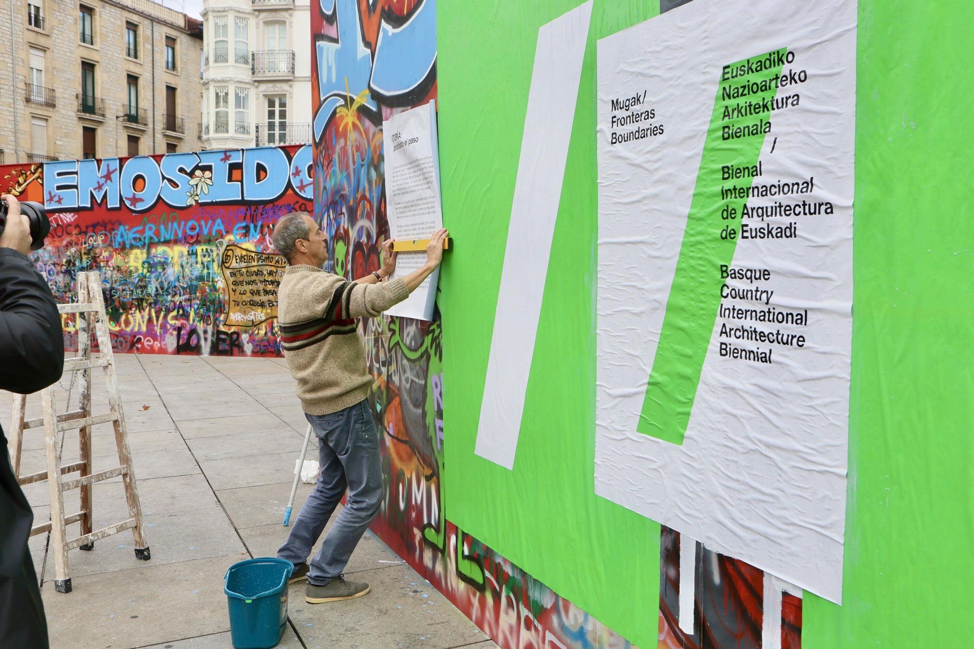 El muro efímero levantado en la plaza de la Virgen Blanca es el emblema de la Bienal Internacional de Arquitectura de Euskadi Mugak, que desde hoy y hasta el 13 de noviembre programará exposiciones, talleres y otras actividades en la capital alavesa. La presentación de la programación ha tenido lugar precisamente junto a este muro rojo de cuatro metros de alto que se colocó para invitar a la ciudadanía a plasmar en él las pintadas que desearan.