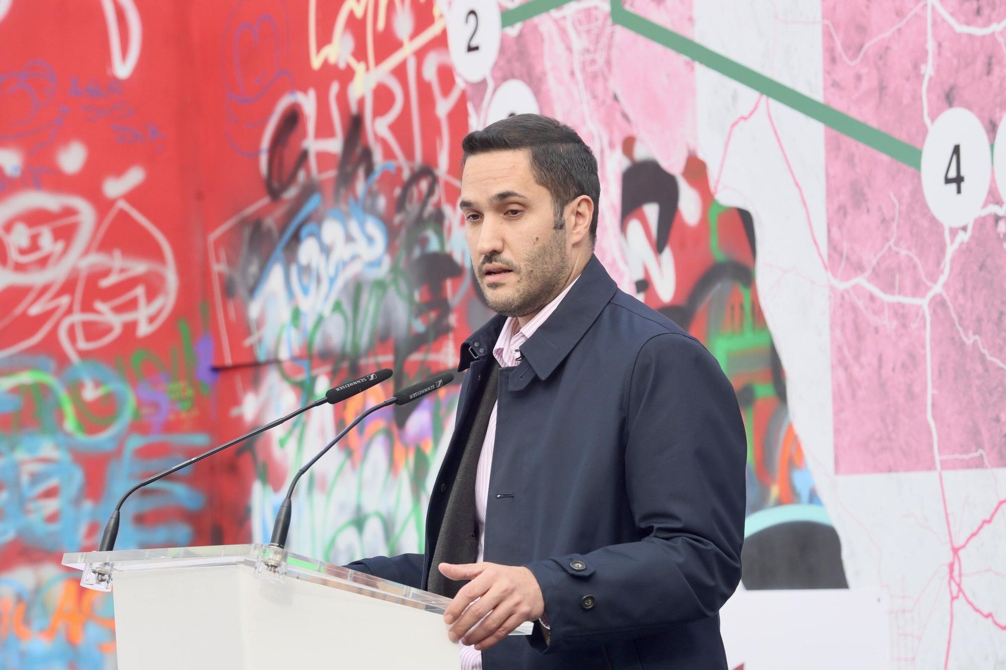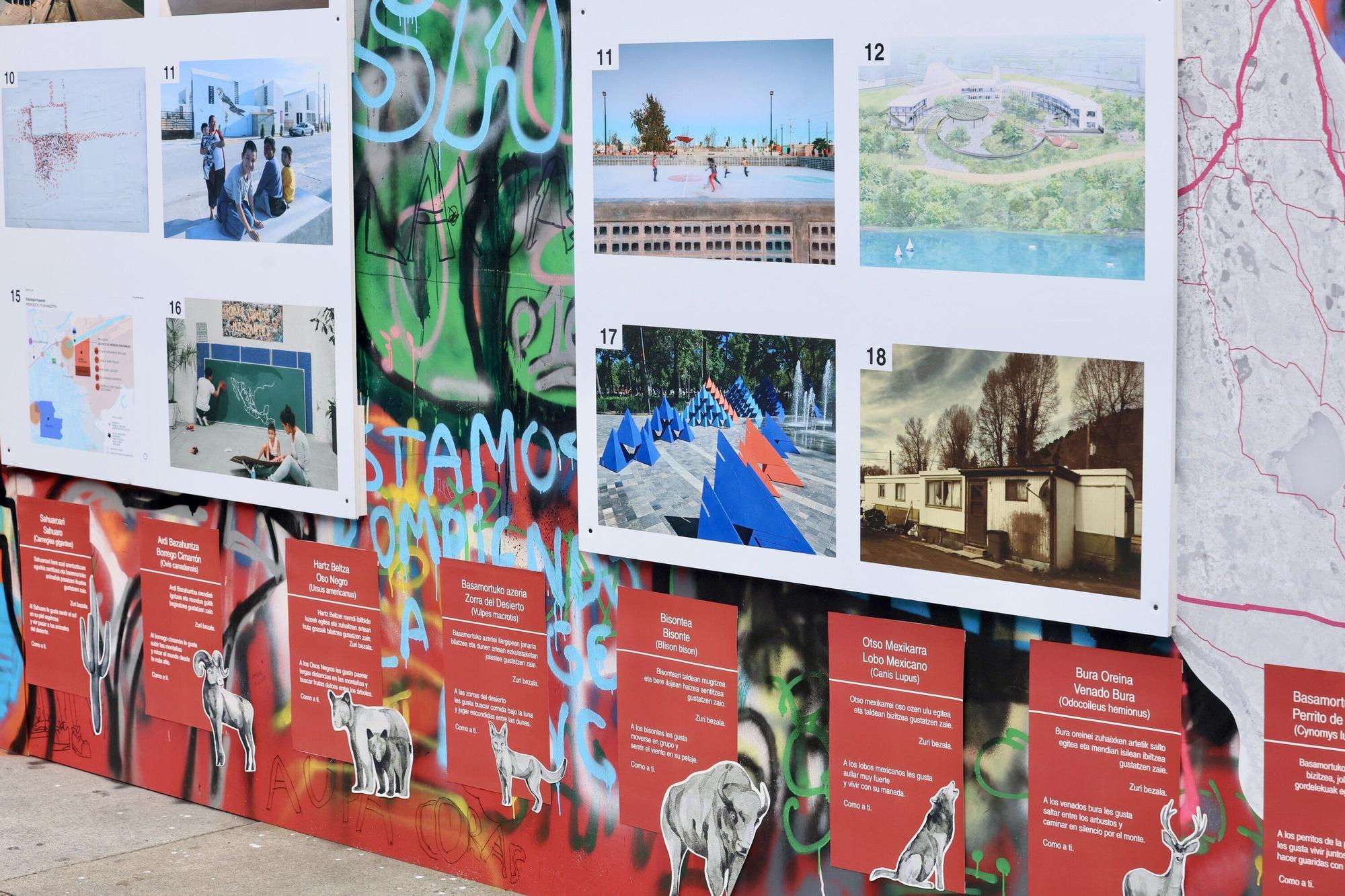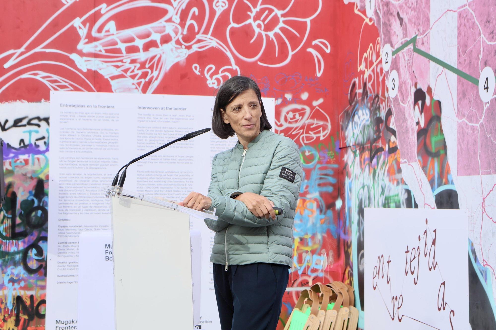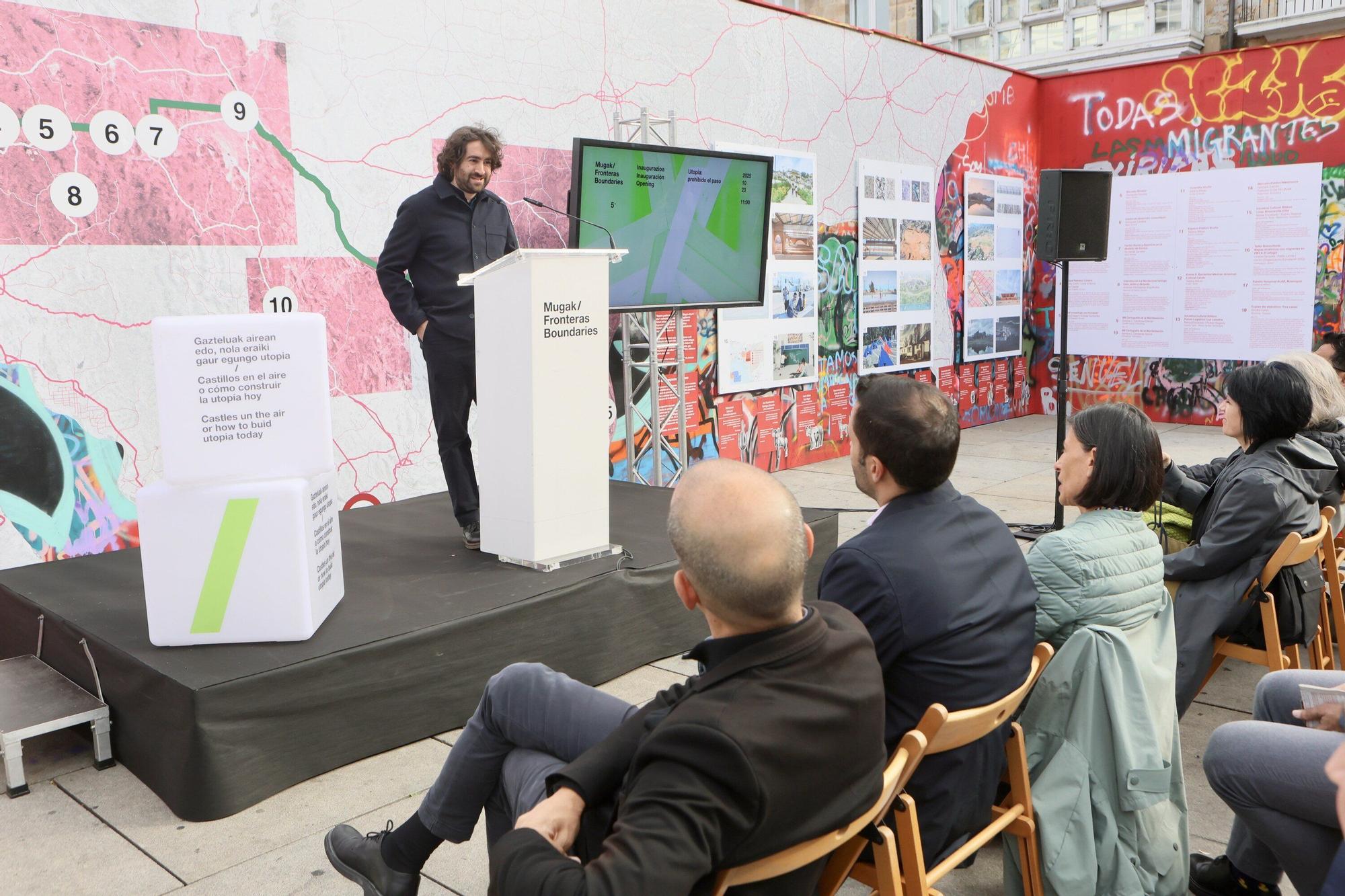 El muro efímero levantado en la plaza de la Virgen Blanca es el emblema de la Bienal Internacional de Arquitectura de Euskadi Mugak, que desde hoy y hasta el 13 de noviembre programará exposiciones, talleres y otras actividades en la capital alavesa. La presentación de la programación ha tenido lugar precisamente junto a este muro rojo de cuatro metros de alto que se colocó para invitar a la ciudadanía a plasmar en él las pintadas que desearan.