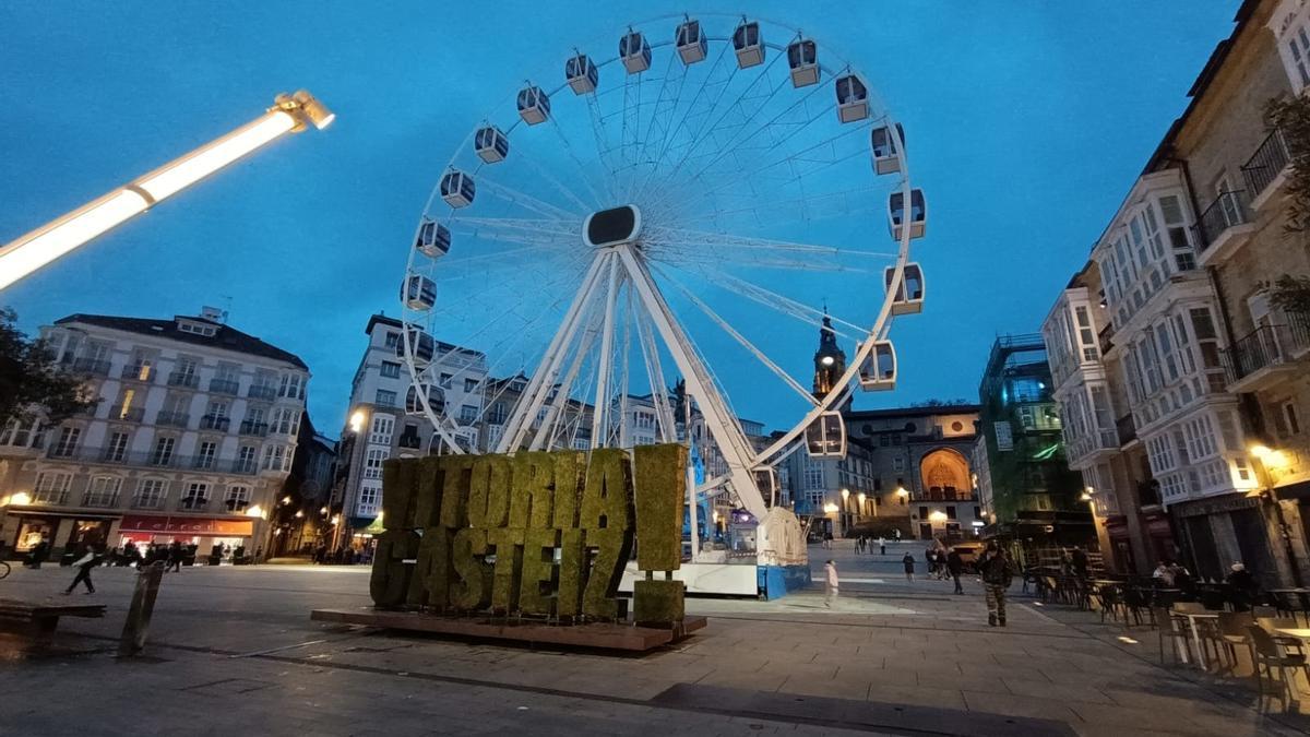 Desde el 28 de noviembre todos los vitorianos podrán disfrutar de la gran noria que se ha instalado donde hasta hace unos días estaba el muro efímero levantado en la plaza de la Virgen Blanca como emblema de la Bienal Internacional de Arquitectura de Euskadi Mugak. Esta compartirá espacio con un carrusel clásico para deslumbrar la plaza de la Virgen Blanca.