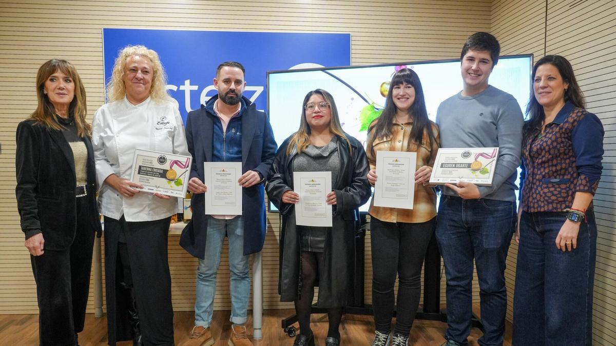 Eguren Ugarte y la propuesta de la Taberna Erkiaga 'crema de morcilla con foie, manzana y mousse de piparrak' han sido elegidos como el pintxo y la bodega favoritos del público en la cuarta edición de los Premios Ardoaraba. Erkiaga se ha hecho con esta distinción por segundo año consecutivo. Representantes de ambos establecimientos han recogido el diploma que les acredita como ganadores, tras destacar entre un total de 27 bodegas y 37 propuestas de pintxos.