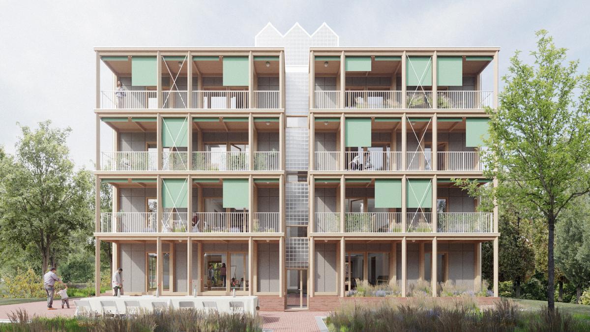 El proyecto internacional 'Care Blanket' (Manta de Cuidado), ganador del concurso para rehabilitar 57 viviendas en cinco bloques residenciales de Bustaldea en Aretxabaleta, plantea primar la eficiencia energética de los edificios con una envolvente de corcho y madera.