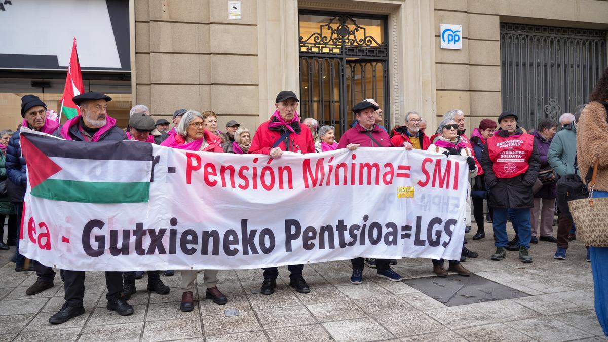 Este colectivo ha convocado concentraciones en las tres capitales vascas y en Pamplona para expresar su "indignación" por el rechazo de "las derechas y las ultraderechas de PP, Vox, Junts y UPN" al decreto de revalorización de las pensiones, con su voto en contra el pasado martes en el Congreso al real decreto ley que, entre otras cosas, recogía la subida de las pensiones para este año.