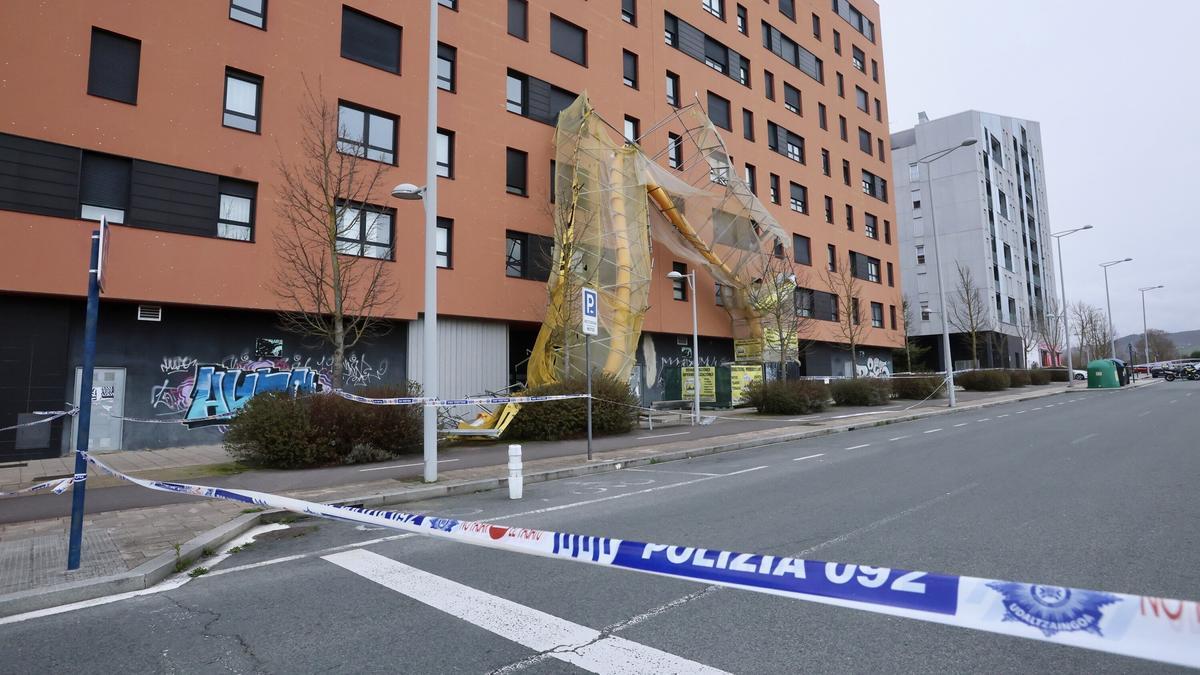 Las ráfagas de aire han provocado la caída de un andamio instalado sobre la fachada del inmueble.