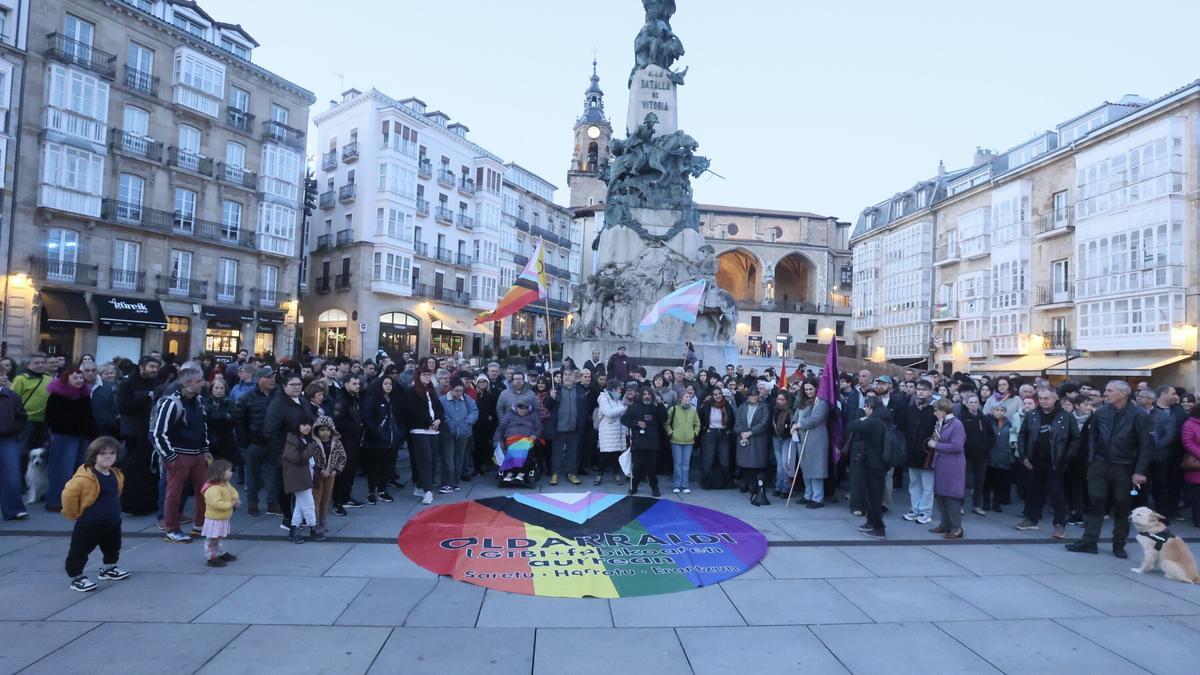 La concentración, convocada por el Observatorio LGTBI+ de Vitoria-Gasteiz Ikusgune, ha reunido en la Plaza de la Virgen Blanca a decenas de ciudadanos, entre ellos algunos representantes políticos e institucionales como la teniente de diputado general de Álava, la socialista Cristina González.