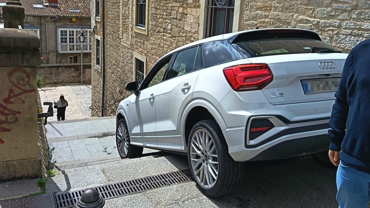 El Casco Viejo cuenta con infinidad de calles estrechas y desvíos que en algunos casos no son aptos para coches. Prueba de ello es el suceso con un vehículo atrapado en las escaleras de Villa Suso la tarde del miércoles. Ha sido necesaria una grúa para poder desencajar el vehículo y colocarlo en el tramo correcto.
