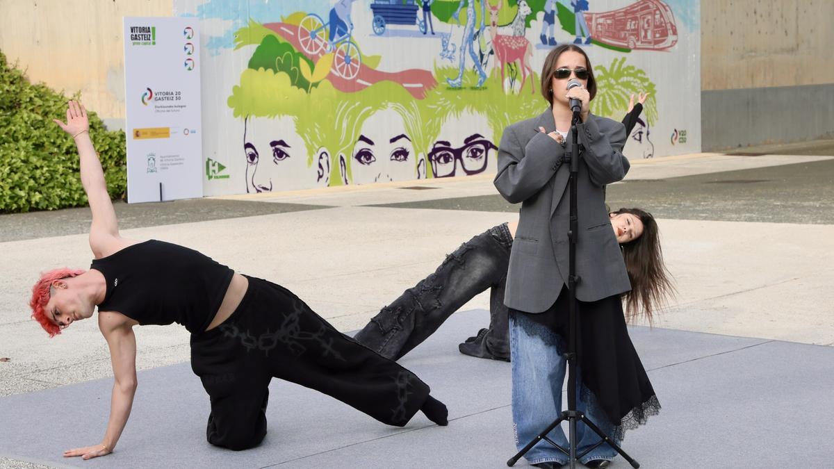La entrada de las piscinas de Mendizorrotza se convirtió este jueves en un espacio para las artes plásticas, la música y el baile, dentro de la iniciativa municipal de la Oficina del Futuro, que pretende integrar y coordinar todas las estrategias que están construyendo el futuro de la ciudad en torno a su Agenda Urbana 2030. No en vano, se inauguró un mural realizado en las inmediaciones de las piscinas de Mendizorrotza, en concreto en la calle José Luis Compañon, frente a la entrada del Kirolklub.
