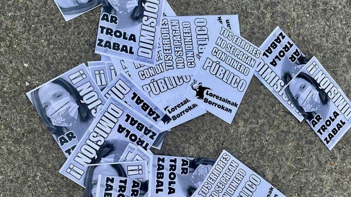 En estas pegatinas, en concreto, se pueden leer frases como "Tus errores no se pagan con dinero público", con el logo de Lorezainak borrokan, y "Artolazabal dimisión".