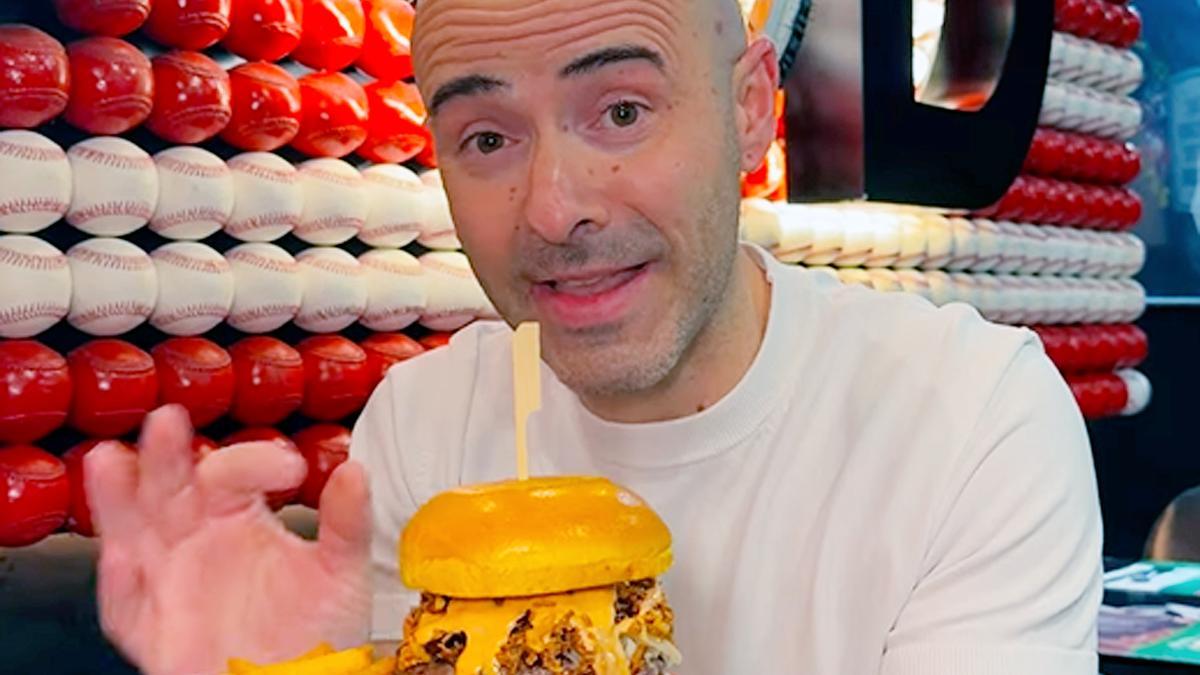 “Siguiente parada, estamos en Bandaliko y esta preciosidad se llama 'Holy Fuck’. Carne de rubia gallega madurada, queso provolone, salsa de yema, mayo trufada y bacon crunchy”, cuenta, enumerando sus ingredientes. “Fijaros en el corte, vamos a por ella”, dice, mientras la prueba.