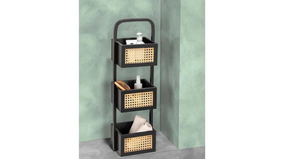 El mueble es una estantería de baño de la marca Wenko, reconocible por su diseño minimalista y por su capacidad de almacenamiento. Posee tres cestas integradas que permiten la organización de productos de higiene, cosméticos o electrodomésticos como, por ejemplo, secadores de pelo o planchas. Su tamaño compacto, con medidas estimadas de 23 x 18,5 x 73 cm, permite colocarlo en espacios pequeños sin perder su capacidad de almacenaje.