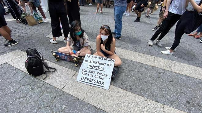 "¿Cómo se escribe racista? NYPD (siglas de la policía de Nueva York)", "Estos policías racistas se tienen que ir", "Manos arriba, no dispares", "No puedo respirar". Son muchas las consignas que los manifestantes, en riadas multirraciales pero en su mayoría jóvenes blancos, coreaban por las avenidas y plazas de Manhattan o Brooklyn, en protesta por la muerte con tintes racistas del afroamericano George Floyd a manos de un policía blanco en Mineápolis (Minesota).