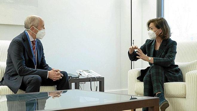 Covid-19. El encuentro que mantuvieron ayer en Madrid el vicelehendakari Josu Erkoreka y la vicepresidenta primera, Carmen Calvo, sirvió también para abordar otras cuestiones más allá de los traspasos: las relativas a la lucha contra la pandemia y a los fondos europeos. Sobre la situación sanitaria por el covid-19, Calvo y Erkoreka analizaron las políticas contra el virus; en concreto, el marco de “cogobernanza” y el marco jurídico para hacer frente a la pandemia.