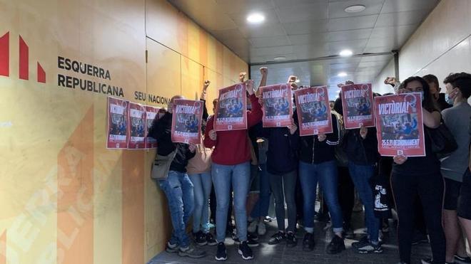 Activistas vinculados a sindicatos de la vivienda de Barcelona han ocupado la sede de ERC en la calle Calàbria en protesta por el desahucio del bloque Llavors este martes por la mañana, en el que participan agentes antidisturbios de los Mossos d'Esquadra.