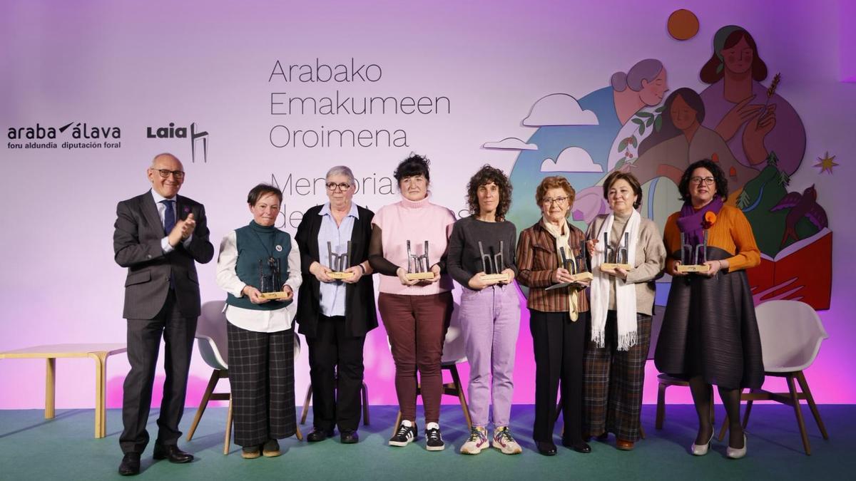 Ekitaldiaren une nagusian, Arabako diputatu nagusiak zazpi laia eman dizkie “atzoko esperientziak gaurko esperientziekin lotzen dituen haria irudikatzen duten” kuadrilla guztietako emakumeei eta elkarteei, historian zehar emakume arabarrek egindako ekarpenak bildu, babestu eta transmititzeagatik.