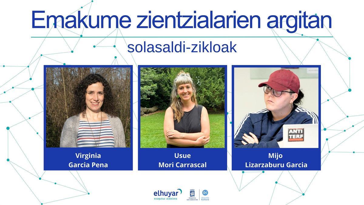 Antolatzaileek jakinarazi dutenez, solasaldi guztiak 19:00etan izango dira, Donostiako Ernest Lluch Kultur Etxeko areto nagusian, eta, aurrez aurreko elkarrizketen bidez, zenbait arlotan lan egiten duten hiru emakume zientzialari ezagutzeko aukera izango da Ana Galarraga Aiestaran Elhuyarreko zientzia komunikatzailearen eskutik: Virginia Garcia Pena, Usue Mori Carrascal eta Mijo Lizarzaburu Garcia.